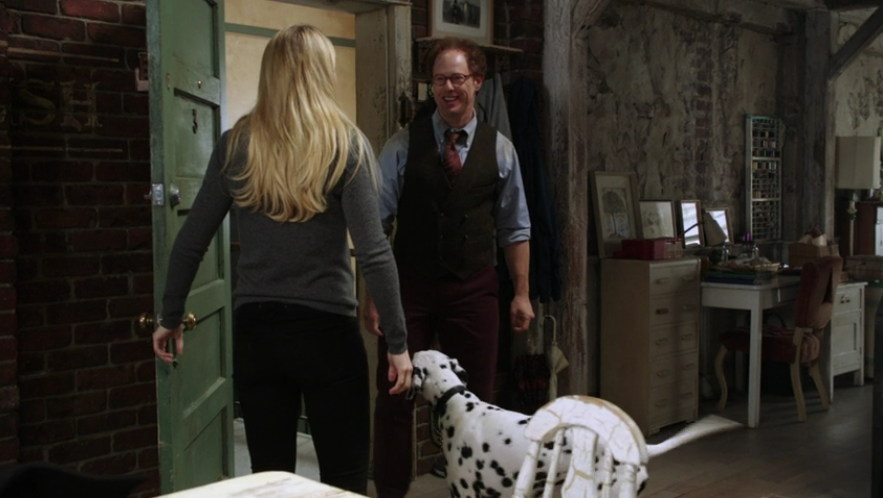 In Storybrooke, Belle works to restore the public library in advance of its reopening. Hook confronts her there, Belle recalling his earlier attempt at kidnapping her and fleeing. She escapes into the formerly hidden elevator and calls Gold, though the call is hindered by concerns of construction.